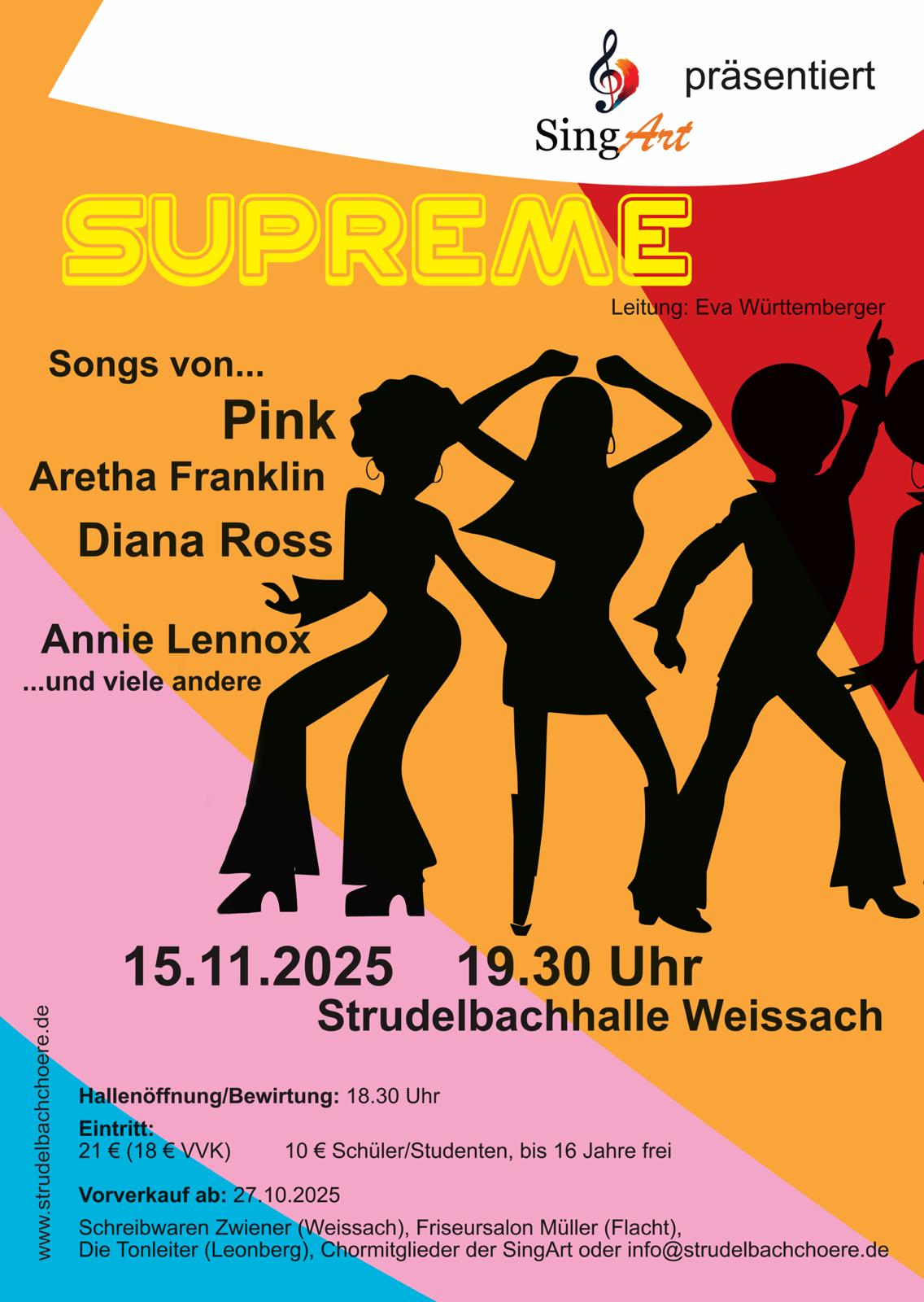 Wussten Sie, wie viele großartige Komponistinnen es gibt? Die Frauen von SingArt unter der Leitung von Eva Württemberger gehen dieser Frage mal ernst, mal mit Augenzwinkern und vor allem mit jeder Menge gut gemachter Chormusik nach! Ein mitreißender und spannender Einblick in die Geschichte der weiblichen populären Musik erwartet Sie. Swing, Pop, Disco und Soul. Von den Andrew Sisters bis Pink, von den Ronettes bis Aretha Franklin und viele andere mehr...